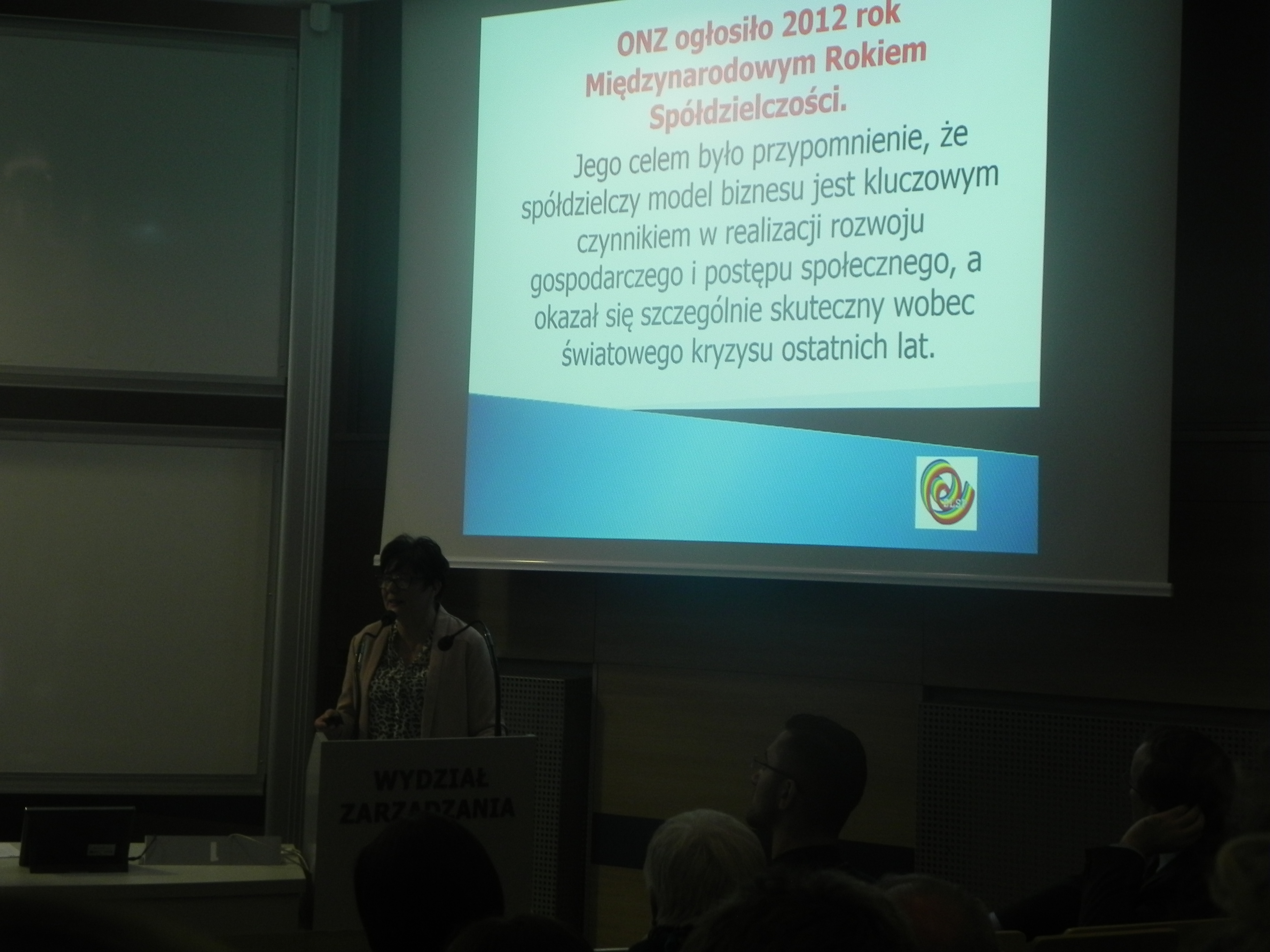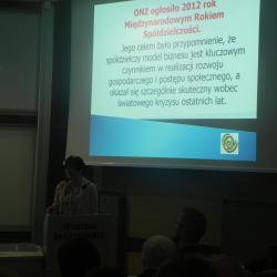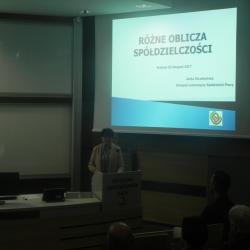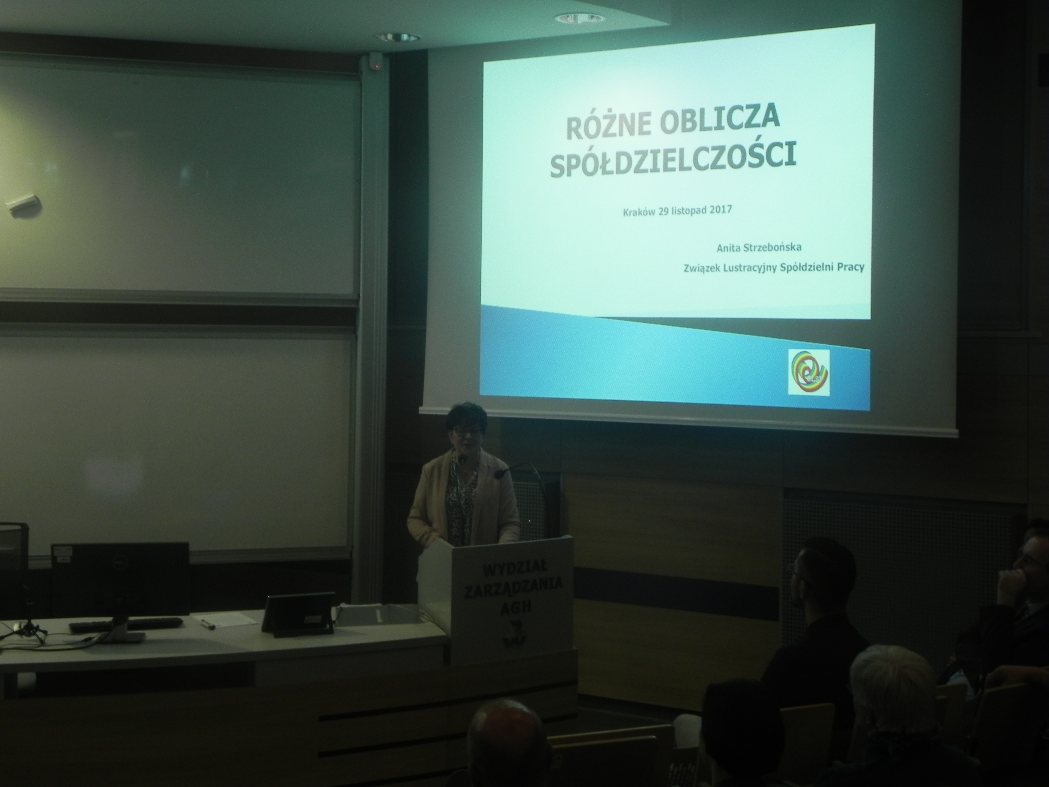 Moderator spotkania dr inż. Joanna Duda zapowiadając prezentację przygotowaną przez przedstawiciela Związku Lustracyjnego Spółdzielni Pracy pt. „Różne oblicza Spółdzielczości” Anita Strzebońska podkreśliła, że warto zainteresować się tą branżą. W związku z tym licznie zgromadzone grono studentów i biznesu z dużym zainteresowaniem wsłuchiwało się w przygotowany referat. Anita Strzebońska opowiedziała krótką historię spółdzielczości, która do dnia dzisiejszego odgrywa znaczącą rolę i ma duży wpływ na obecną działalność tej formy gospodarowania. Porównała spółdzielnię do spółki. Powiedziała dlaczego spółdzielnie możemy uznawać za organizacje o szczególnej misji i omówiła działalność spółdzielni podając znane przykłady firm. Na zakończenie zaapelowała do młodych ludzi, aby zapoznali się głębiej z ideą spółdzielczości, aby spróbowali przygody ze spółdzielczością podejmując pracę po zakończeniu studiów. Podkreśliła, że spółdzielczość to nie tylko jedna z wielu form prowadzenia działalności gospodarczej, ale również to styl życia oparty na fascynującej tradycji, który daje odpowiedź młodym ludziom na pytania nurtujące pokolenia wchodzące na rynek pracy. To właśnie młodzi ludzie coraz częściej wybierają taki styl działania na rynku, który poza zyskiem pozwoli budować relacje społeczne, a nawet towarzyskie! spółdzielczość ewoluuje i staje się coraz bardziej dogodną formą gospodarczej organizacji, atrakcyjną szczególnie dla młodych ludzi, którzy odrzucają zarówno model klasycznej pracy najemnej dyktowanej rygorami kodeksu pracy, jak i modelu korporacyjnego dążącego do maksymalizacji zysku i eksploatacji jednostek. Jej wystąpienie spotkało się z wielkim zainteresowaniem i przyjęciem o czym może świadczyć to, że na zakończenie swojego wystąpienia otrzymała burzę oklasków.