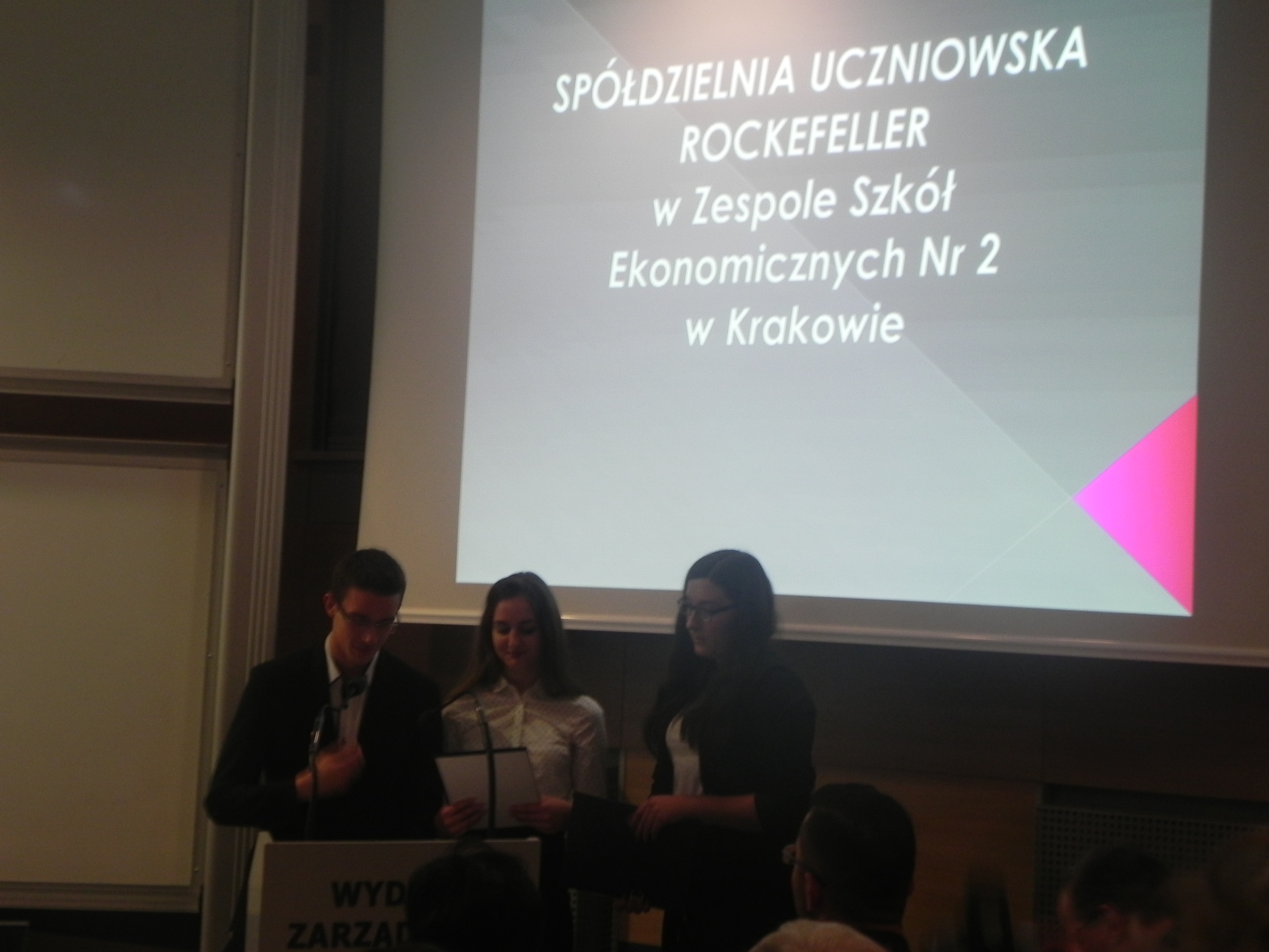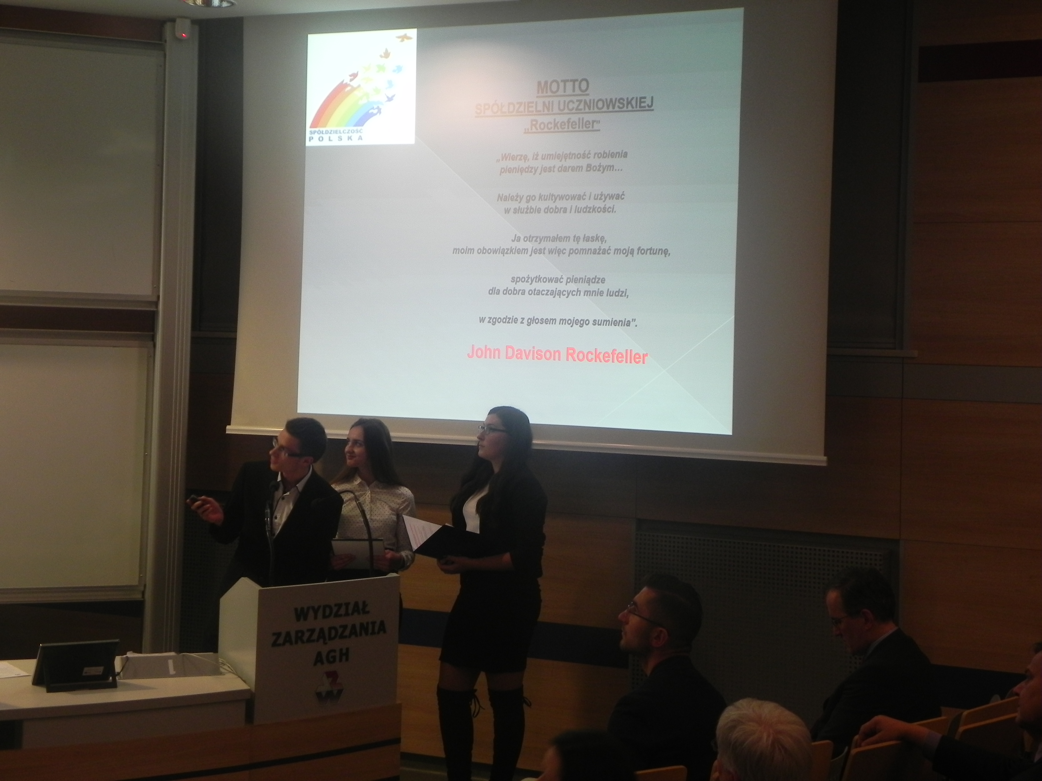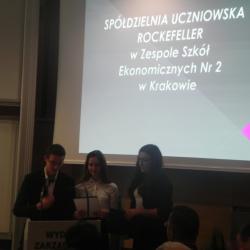 Ostatnią prezentację na spotkaniu pt. „Spółdzielnie uczą biznesu” przedstawili uczniowie ze Spółdzielni Uczniowskiej Rockefeller działającej w Zespole Szkół Ekonomicznych Nr 2 w Krakowie. Opowiedzieli z wielkim zapałem, zaangażowaniem zebranym czym się zajmują, dlaczego tak ważną lekcją dla nich jest praca w spółdzielni uczniowskiej. Młodzi spółdzielcy podkreślali, że spółdzielnia poprzez zabawę uczy ich przedsiębiorczości i jest dobrą szkołą gospodarowania, a więc wspaniałym przygotowaniem do dorosłego życia.